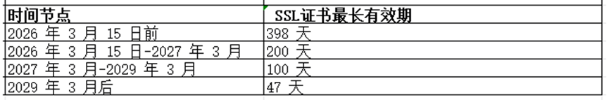 2025年4月 CA/B论坛投票通过SC-081v3提案:全球公开信任公有SSL证书的最长有效期将分阶段调整,第一阶段,所有SSL证书最长有效期缩短至200天;预计2029年3月15日后,进一步缩短至47天。具体时间计划如下: