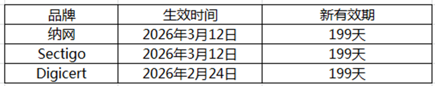 · 证书重签:根据各品牌生效日起,所有重签的SSL证书最长有效期不超过199天。